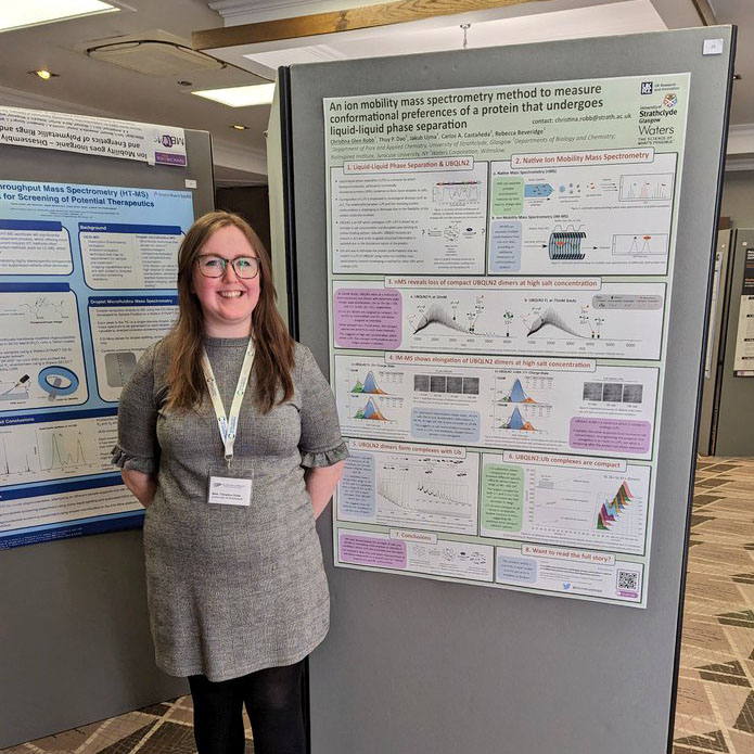 Christina Glen Robb is a PhD student who joined in October 2021, funded by EPSRC in collaboration with Waters. She completed her BSc in Chemistry with Drug Discovery at the University of Strathclyde, followed by an MSc in Medicinal Chemistry at the University of Glasgow where she did her project on cyclic peptide based HDAC inhibitors for inhibition of protein-protein interactions under the supervision of Dr Andrew Jamieson. Her PhD research is currently focused on intrinsically disordered proteins, using ion mobility-mass spectrometry to investigate IDPs known to liquid-liquid phase separate. Right now, she is investigating UBQLN2 and associated constructs to delineate the overall conformation ensemble for this protein to aid in the understanding of its phase separation mechanisms. In her free time, she likes to bake, watch musicals, and play fantasy RPGs.